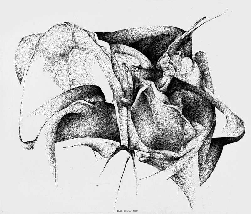 Die Käfer-Serie, in der Grundklasse von Prof. Hans Thiemann an der Hamburger HfbK in Erledigung der Aufgabe „Thema und Variationen“ entstanden, enthält die ersten für meine späteren Arbeiten charakteristischen Zeichnungen. Weitere hier vorgestellte Federzeichnungen – und eine Bleistiftzeichnung – fertigte ich als Schüler bei den Professoren Paul Wunderlich und Rudolf Hausner bzw. kurz nach dem Ende des Kunststudiums an. Zur akribisch gezeichneten Hand schrieb ich einmal anlässlich einer Ausstellung: „Und was tat der Altachtundsechziger im Jahre 1968? Im Jahre 1968 zeichnete der Altachtundsechziger 6 Monate lang seine linke Hand mit der Feder.“ Mit der Federzeichnung einer Titelseite der BILD wendete ich mich erstmals der politischen Realität zu, während die organischen und selbstbildnerischen Zeichnungen eher den Innenblick kultivierten.